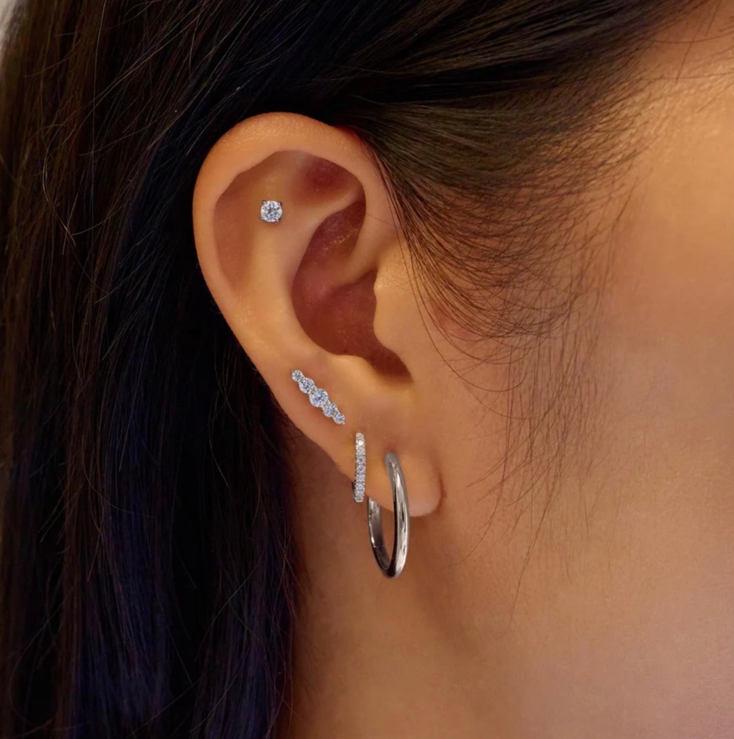 Complete your ear party with our bar barbell stud, featuring a sparkling center cubic zirconia flanked by four graduating stones. Designed to stack effortlessly with other pieces, it adds refined dimension to your curated earscape.