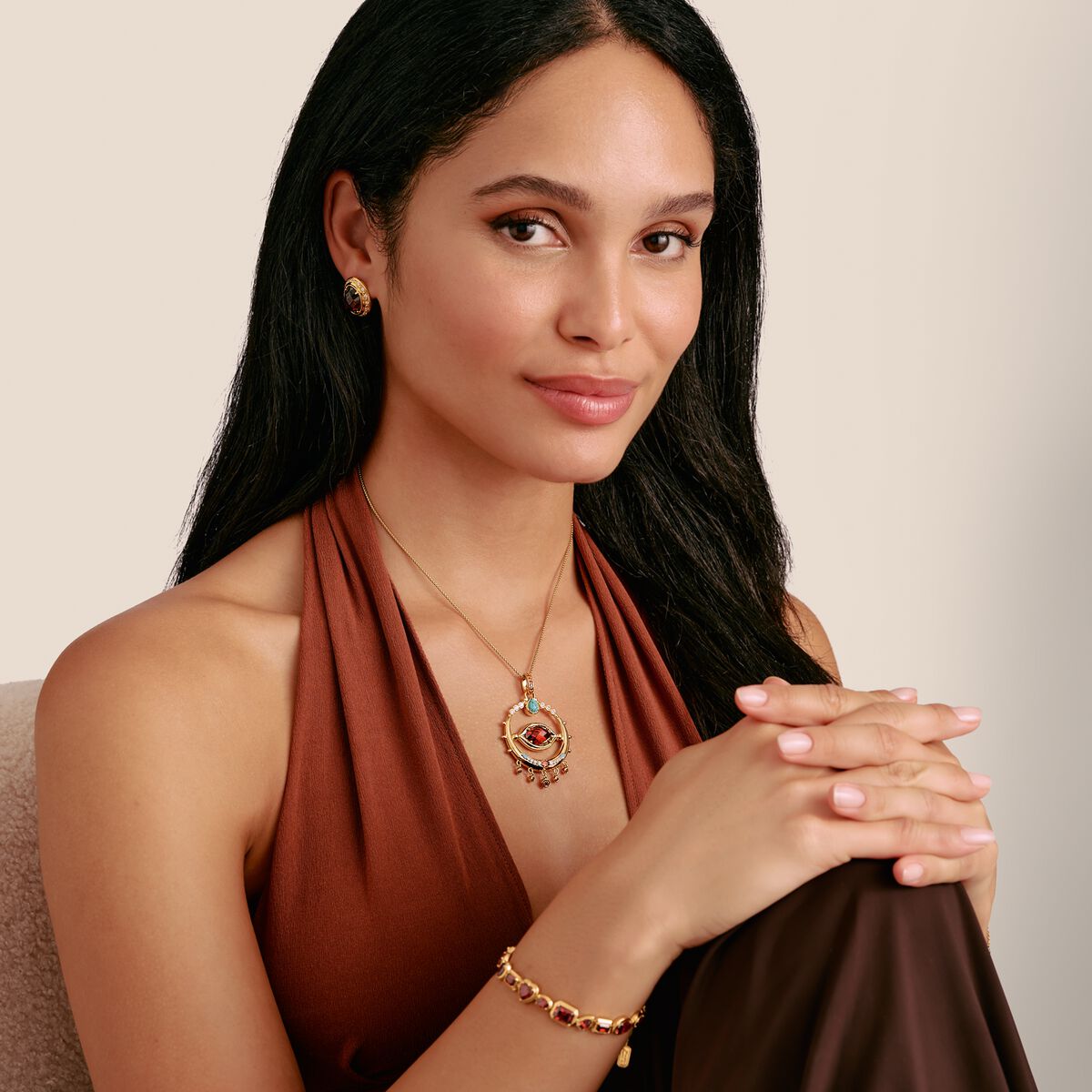 A look that is more than just jewellery: this artfully designed amulet pendant made from recycled 925 silver with elegant 18k gold plating is one of the key pieces in the Elyndra collection. In the centre is an oval, garnet-red zirconia - stylised as an eye, framed by white zirconia and imitation turquoise. Finely set stones above and below the centre frame the design in an exciting way. Moving, round elements at the lower edge add dynamism and depth. A powerful symbol of vigilance and awareness - worn as an expression of protection, presence and inner clarity. Dimensions: 57 x 39 mm.