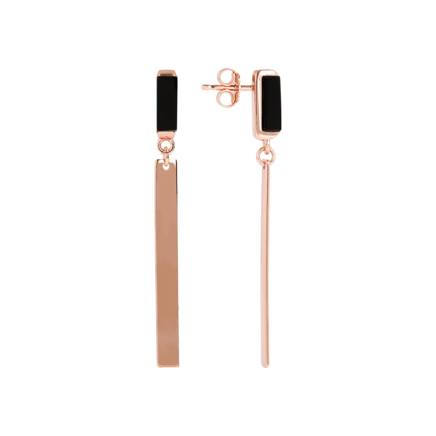 Alba Carré cut dangle earrings combine select natural stones with rectangular 18k rose gold plated Golden Rose elements. The jewelry is offered in black onyx, striated white agate or malachite. Pair them with the matching ring and Alba geometric creations: choose natural stone bijoux available online and at retailers.