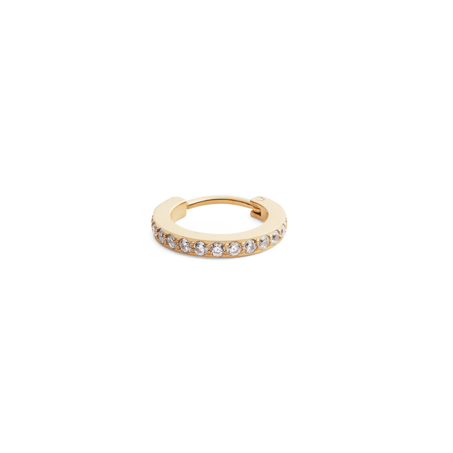 Experiment with different symbols and shapes—like these gold crystal hoops—mix and match, and build a look that’s totally your own. To achieve perfectly clean edges, the crystals are placed and set with great care, in order to hide as much metal as possible.