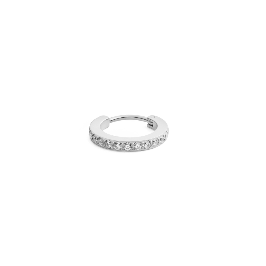 Experiment with different symbols and shapes—like these silver crystal hoops—mix and match, and build a look that’s totally your own. To achieve perfectly clean edges, the crystals are placed and set with great care, in order to hide as much metal as possible.