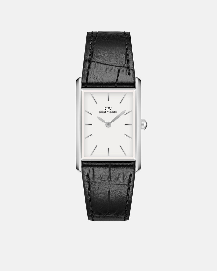 With sleek geometric edges and two sizes to choose from, our Bound collection brings perfect symmetry to your wrist. The curved rectangular case of this silver watch matches the exact width of its crocodile pattern black leather strap—giving you a seamlessly integrated dial.