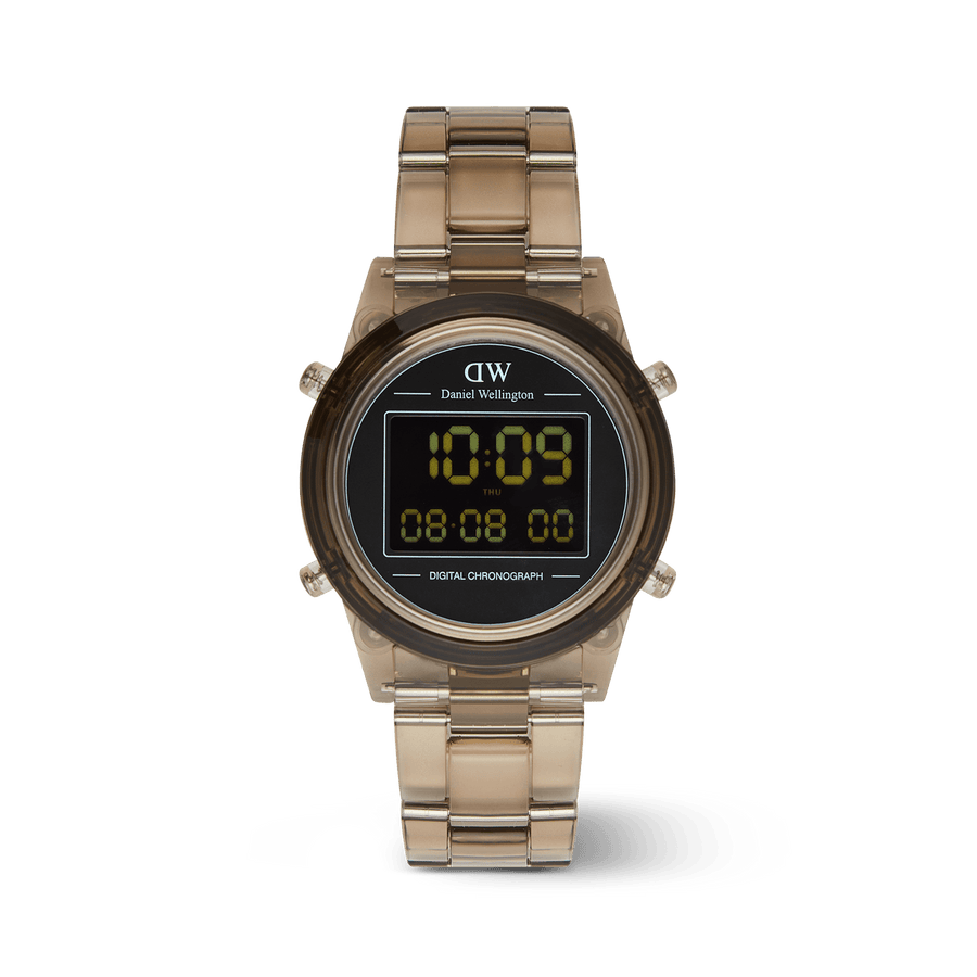 Introducing the Retro Digital Watch: a blast from the past with all the modern features you need. Crafted from transparent bio-based plastic in a cool tone colour palette, this timepiece effortlessly blends throwback charm with contemporary materials for a truly distinct aesthetic. And while its silhouette takes inspiration from our renowned Iconic Link design, we’ve gone truly digital with 10-digit dual time display, auto calendar with a daily alarm and hourly chime, and chronograph function. This dark brown version is available in two sizes.