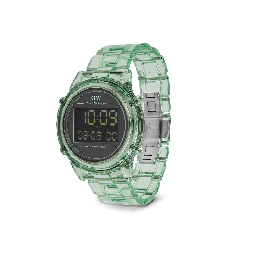 Introducing the Retro Digital Watch: a blast from the past with all the modern features you need. Crafted from transparent bio-based plastic in a cool tone colour palette, this timepiece effortlessly blends throwback charm with contemporary materials for a truly distinct aesthetic. And while its silhouette takes inspiration from our renowned Iconic Link design, we’ve gone truly digital with 10-digit dual time display, auto calendar with a daily alarm and hourly chime, and chronograph function. This light green version is available in two sizes.