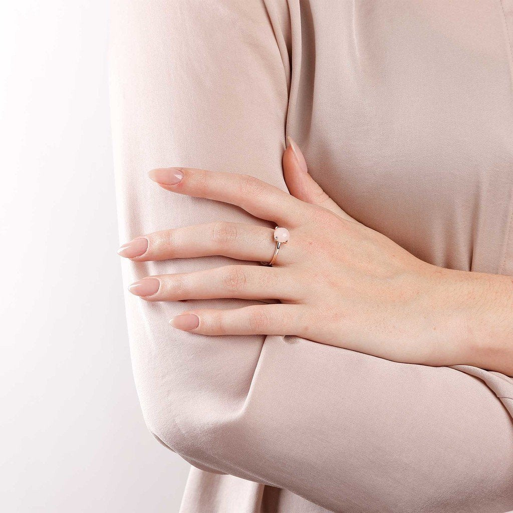 Bronzallure most iconic small solitaire ring with semiprecious genuine gemstones: our most beloved and clicked cocktail ring! From Bronzallure MILANO vast selection of cocktail rings, and flawless statement jewellery for the everyday a reinterpretation of the iconic Felicia nr. 13 style crafted in a petite cocktail ring ideal both for the everyday and on formal occasions. Smaller in size, but not in shine this new delicate and wearable design matches the unmistakable warmth of Rose Gold, our proprietary blend that undergoes a meticulous and thick 18K rose gold plating for the utmost class and refinement with a wide selection of highly selected, superbly cut natural gemstones. A brand new idea of gold made affordable and wearable everyday from morning to night. Choose your own Colour and play with style thanks to a wide choice of genuine natural gemstones in the vibrant tones from Nature, embellished thanks to the expert hands and eyes of our gemologists. A slightly minimalist yet very feminine system of four smooth griffes enhances the natural light and competent cut. Wear one for modest yet classy refinement, stack two or three in your favourite combination for an ultra modern mix and match, in remarkable tone on tone or fun rainbow effect. Get inspired! The cocktail ring is the epitome of our affordable jewellery philosophy, incorporating the best craftsmanship, attention to details and our carefully proportioned and renowned 'comfort fit': what will you choose from magnetic and dense chalcedonies, and classy quartz in a wide selection from pastels to neutrals and deep shades?