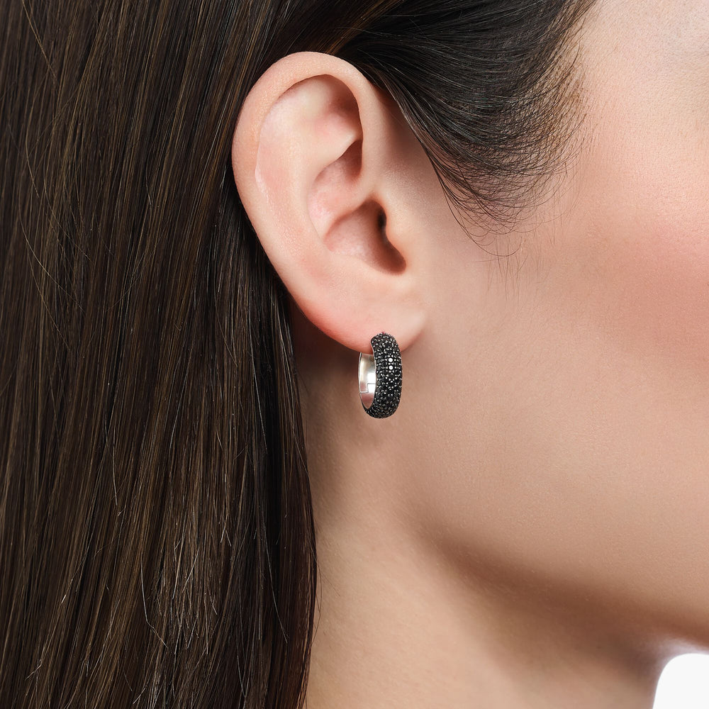 Wear these small, wide hoop earrings made of recycled silver as a tribute to timeless beauty. The design of these hoop earrings with fine zirconia pavé in black reflects the essence of the THOMAS SABO brand. It combines elegance with modern appeal.
