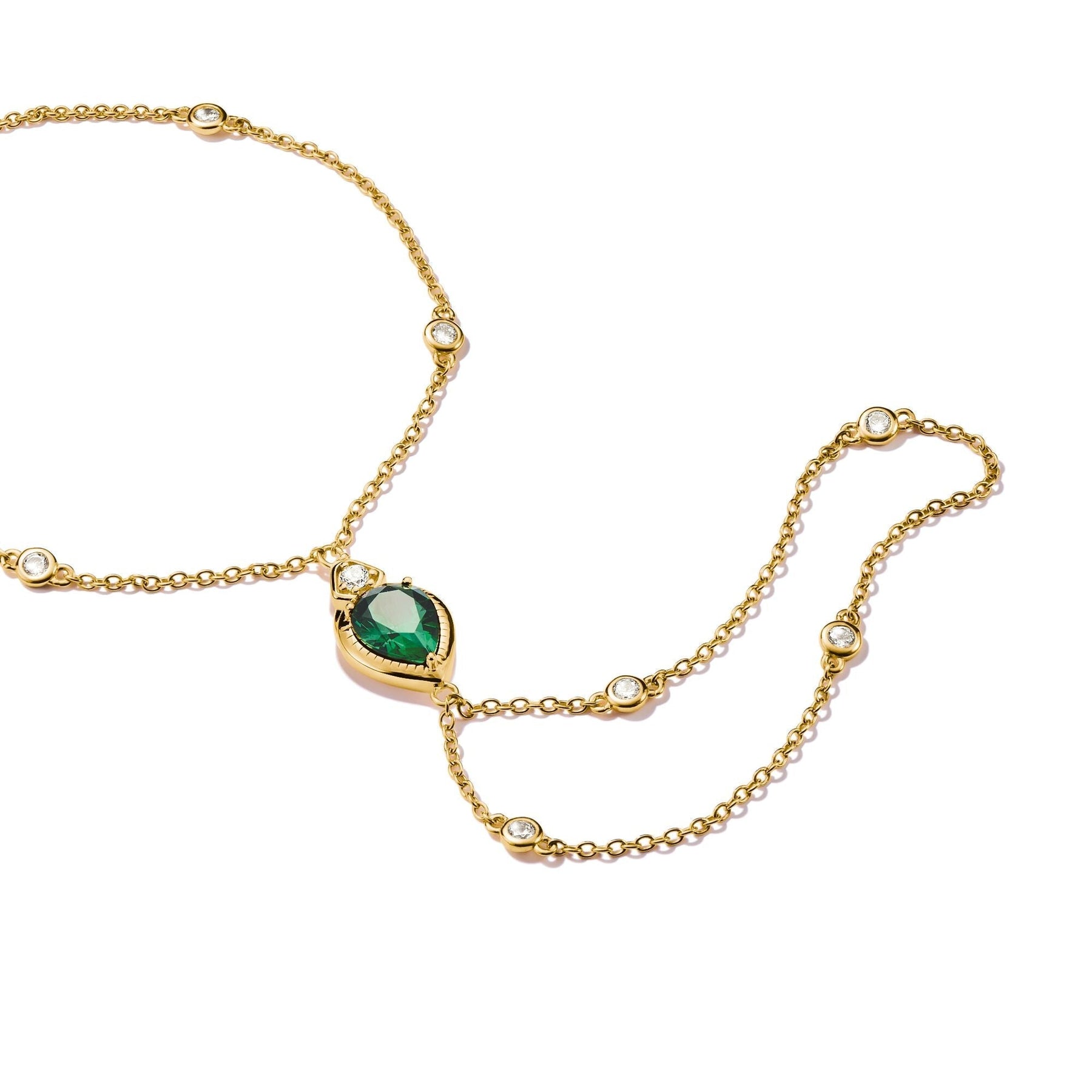 A touch of bohemia, set in golden lines: This extraordinary hand chain made from recycled 925 silver with precious 18k gold plating combines bracelet and finger element to create a flowing jewellery statement - feminine, free and full of symbolic power. Fine necklaces, interrupted by round-cut white zirconia stones, wrap around your wrist and lead to a loop that gently wraps around your finger. An emerald green stone in a high-quality drop cut shines at the centre - powerful and focused. Part of the Elyndra collection - for moments when you show your strength with ease.