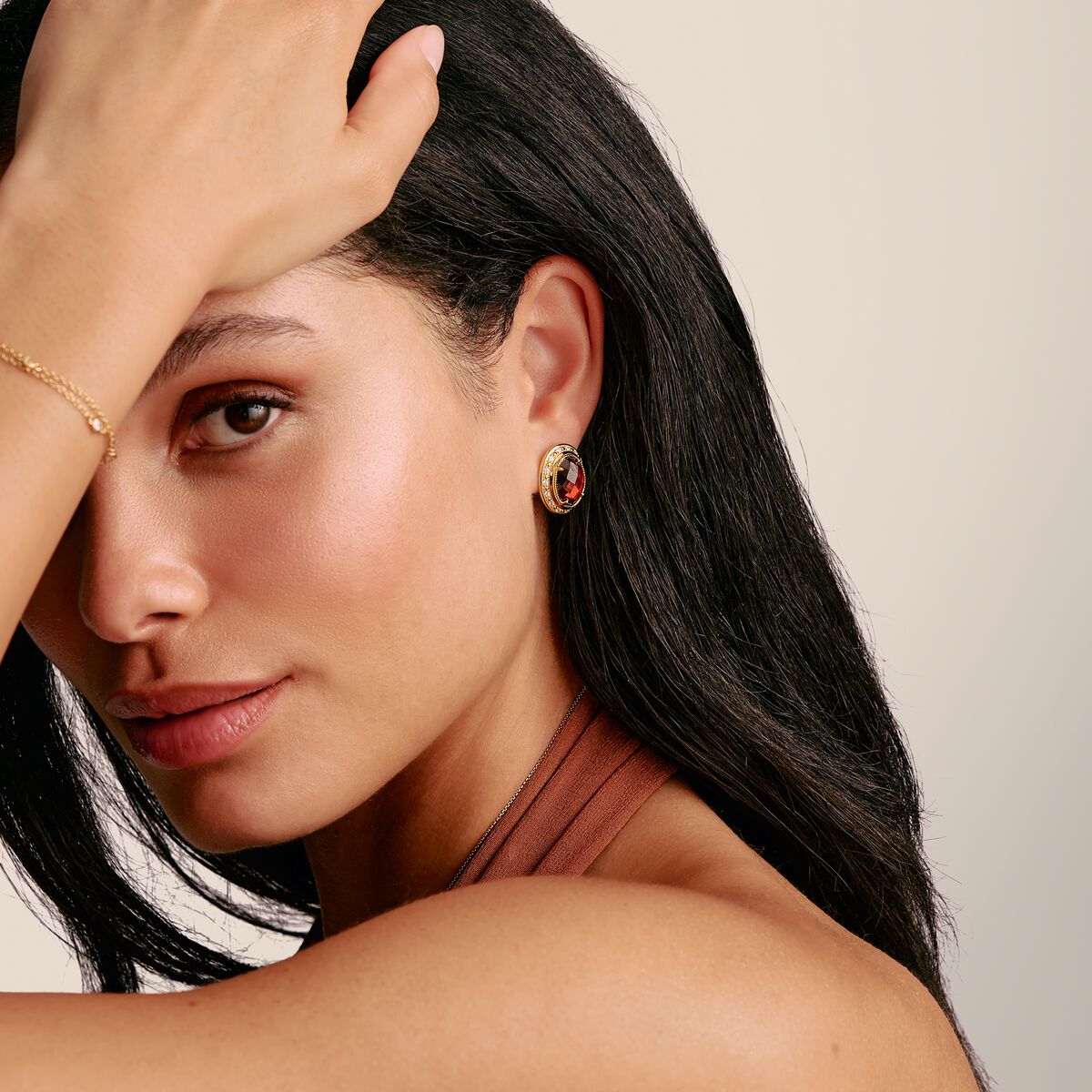 Classic in shape, expressive in detail: these ear studs with a clip fastener made from recycled 925 silver with high-quality 18k gold plating combine vintage charm with modern sophistication. The centrepiece is a garnet-red cubic zirconia in a faceted cabochon cut - powerfully radiant and soft in depth. It is framed by small, round-cut white zirconia stones that lend the design radiant precision. Inspired by the Elyndra collection, these studs combine sensual femininity with a stylish presence - ideal for special occasions or as an elegant statement in everyday life.