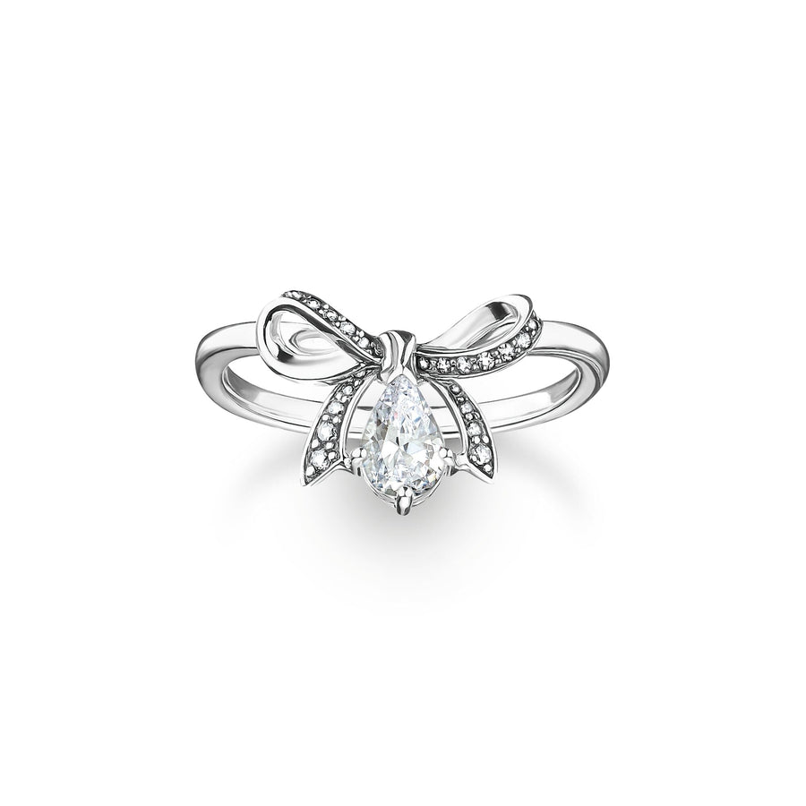 - Filigree ring with a small bow, set with sparkling zirconia stones and a drop-cut zirconia stone