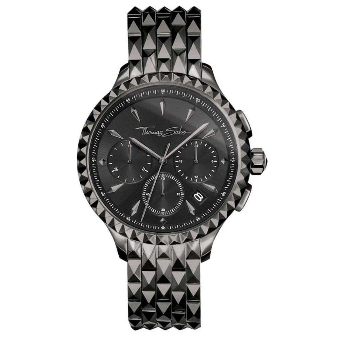 Sleek and bold, the Thomas Sabo Pyramid Black Dial watch is a refined statement in contemporary watch design. Crafted from durable stainless steel with a striking black ion-plated finish, this timepiece features a 38mm case and a black sunray dial framed by pyramid-textured detailing for distinctive edge. The chronograph layout includes hour, minute, and second hands, along with 24-hour and date display functions, powered by a precise Miyota JS25 quartz movement. A hardened, non-reflective mineral glass with sapphire coating protects the dial, while the stainless steel butterfly clasp ensures a secure fit. Water-resistant up to 300 meters, this men’s watch blends fashion and functionality in a way that elevates it within the premium jewelry and watches category.