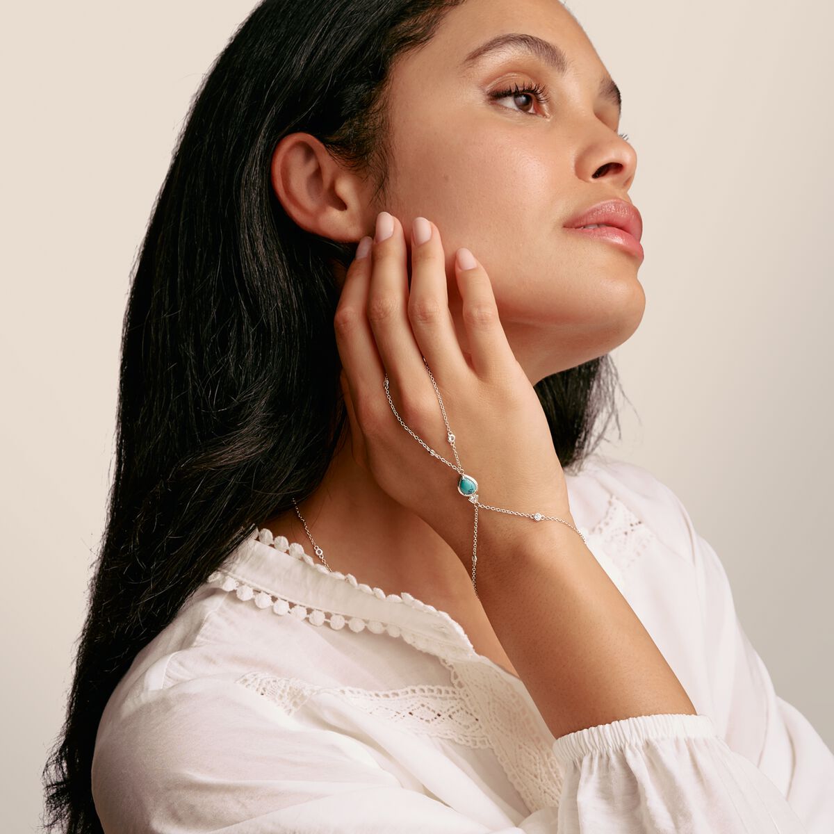 A touch of bohemia, set in silver lines: This extraordinary hand chain combines a bracelet and fine chain to create a flowing statement - delicate, individual and full of symbolic power. Made from recycled 925 silver, filigree necklaces interspersed with round-cut white zirconia stones wrap around your wrist and lead to a loop that wraps elegantly around your finger. A drop-shaped, imitation cabochon-cut turquoise shines in the centre - like a luminous haven of peace. The innovative sliding clasp ensures a flexible fit. Part of the Elyndra collection - for moments when you want to show strength and lightness at the same time.