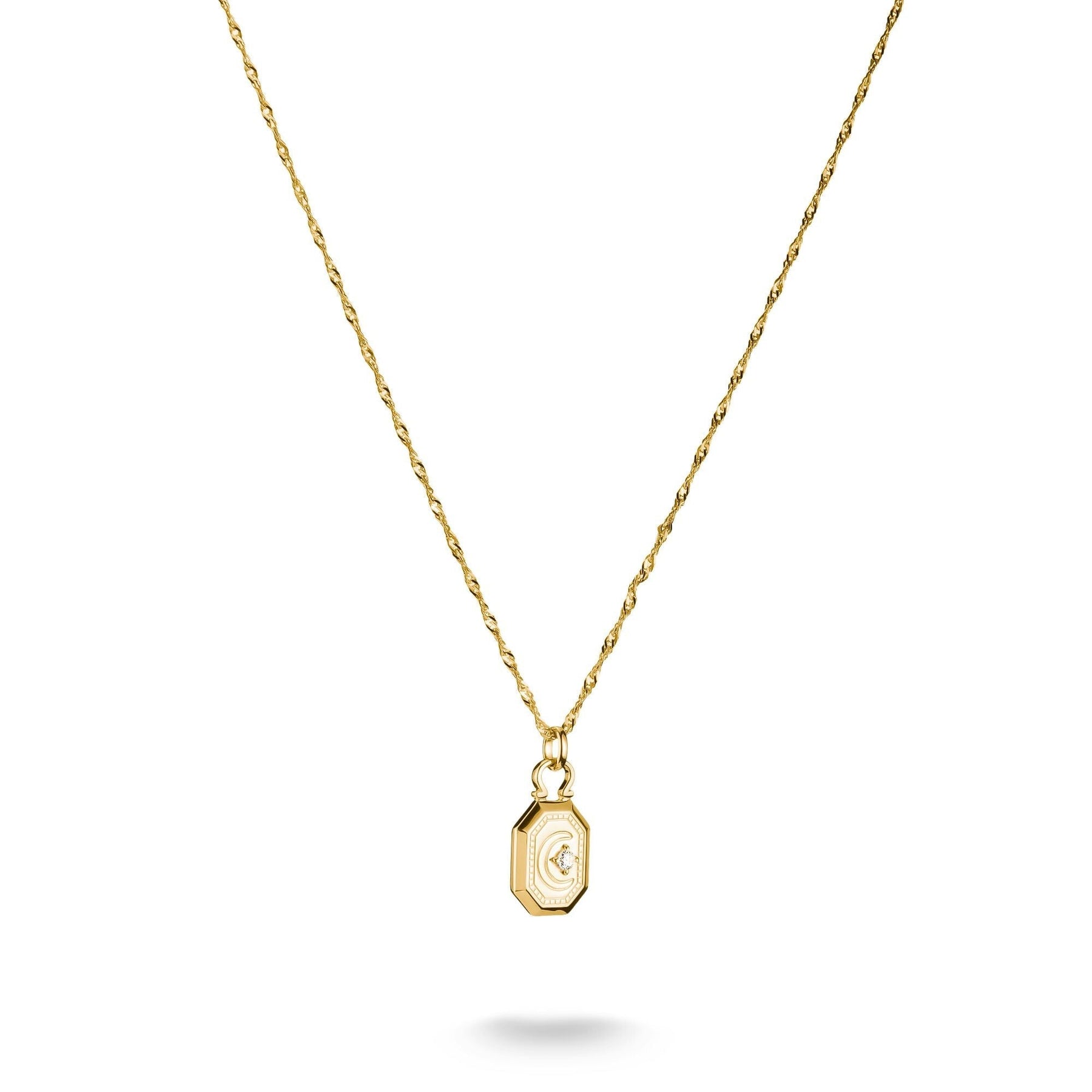 This gold-plated cord necklace features an octagonal pendant with a finely engraved crescent moon and radiant zirconia - a symbol of clarity, change and inner peace. The 3D look gives the design depth and presence. Part of the Elyndra collection - inspired by light, movement and the strength of stillness.